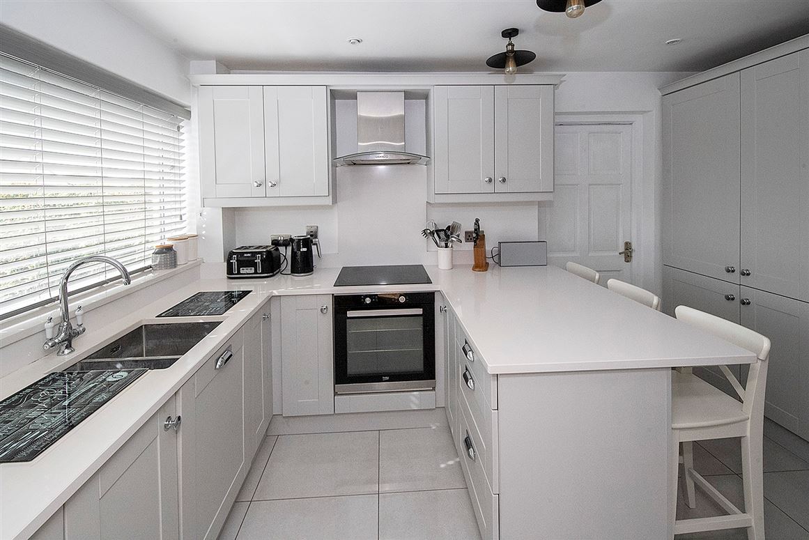 The new kitchen, has all integrated appliances and a sleek quartz counter top along with new tiled flooring and an entrance door to the large garage.