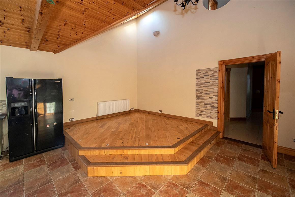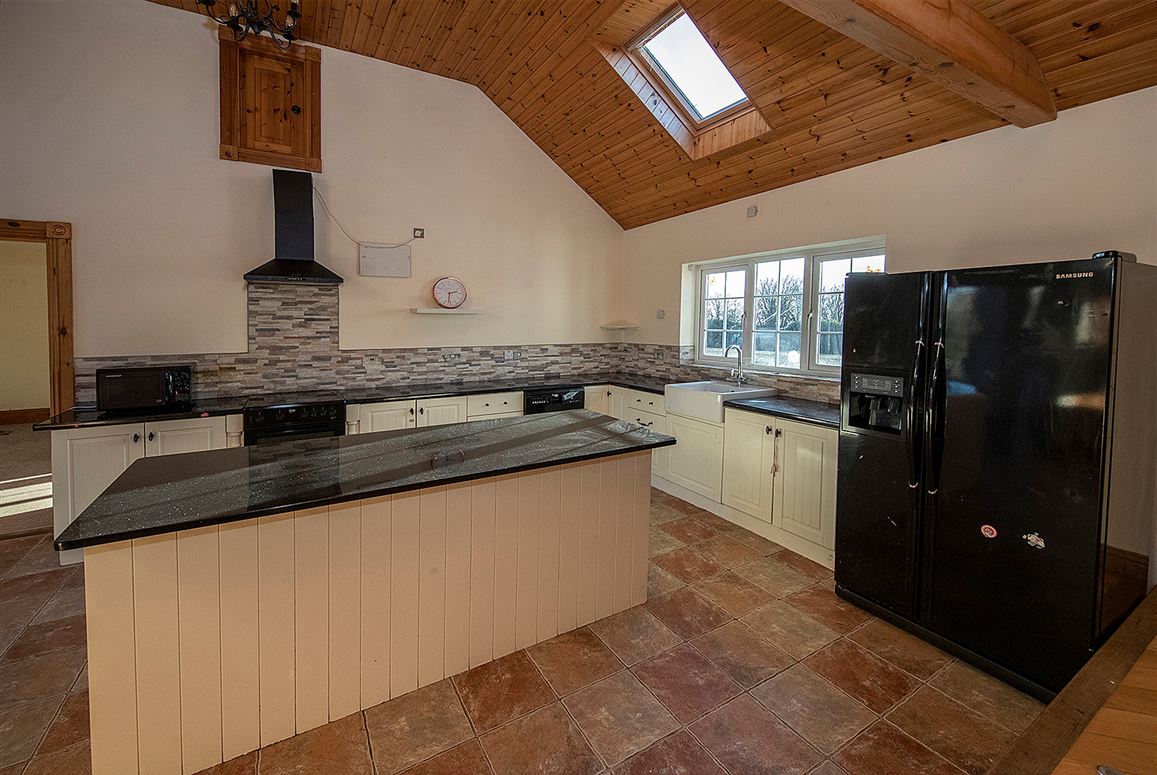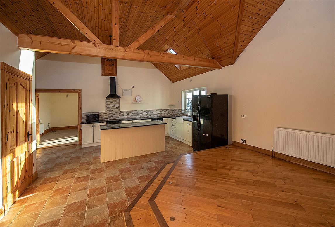 On arrival, you are welcomed by a spacious tiled entrance hall. The impressive kitchen/dining room is truly the heart of the home and a standout feature. It boasts fitted handmade cabinetry, marble worktops and a large central island providing excellent storage. The dining area is set on a raised timber platform with subtle uplighting, creating an ideal space for family meals and entertaining. The double-height ceiling, complemented by skylights and exposed beams, adds to the sense of space and light. A pantry/utility room is located off the kitchen, while double doors lead both to the side of the house and into the spacious living room.