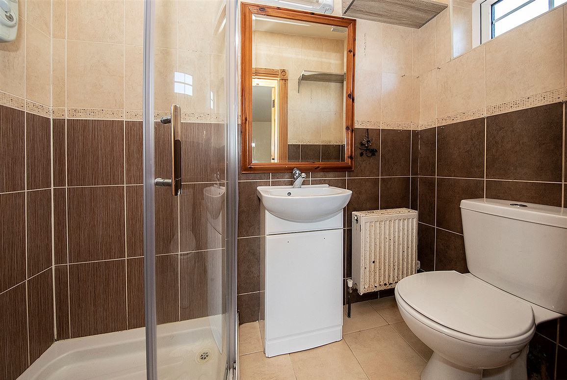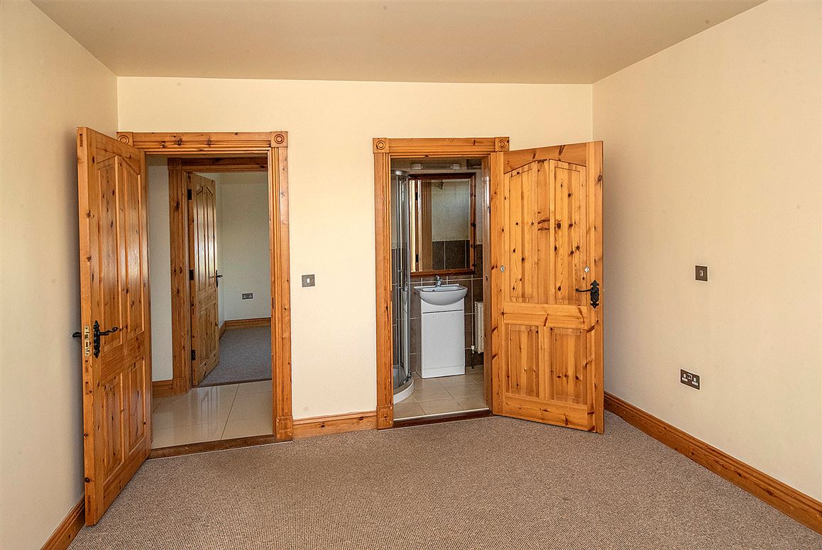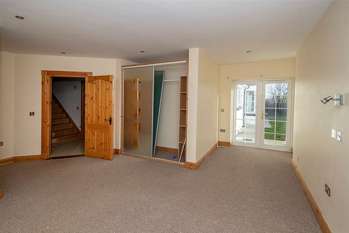 The ground floor accommodation includes a double bedroom with an ensuite (unfinished) and double doors opening onto a patio area overlooking the garden — an ideal spot to enjoy a morning coffee. There are three additional bedrooms on this level, one of which is ensuite, along with a large family bathroom featuring a raised bath area with overhead shower and integrated uplighting.