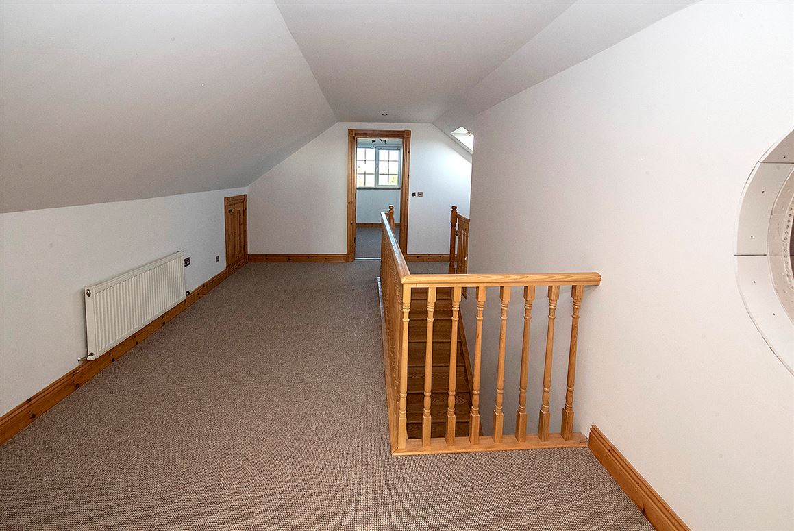 A handcrafted staircase leads to the first floor, where an oversized landing creates a wonderful sense of scale. This level comprises two further generously sized bedrooms, both with Velux windows offering sea views. The landing features a generous overlook window that provides a dramatic view down into the kitchen/dining room, adding a real sense of openness and architectural interest. There is also ample storage available within the eaves.
